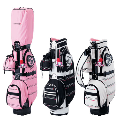 ドッド柄がアクセントのレディス・8型キャディーバッグ。巾着タイプのポーチやチャーム付のネームプレートなど、付属のアクセサリーもとってもキュートです。